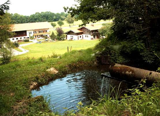 Ca. 200 m hinter dem Hof, am Wasserrad vorbei, befinden sich die Fischteiche. Im frischen Bergwasser werden hier Bachforellen gehalten, die von Kindern immer wieder gerne beobachtet werden. Vor allem aber sind Bachforellen ein hervorragender Speisefisch, der sich frisch vom Grill als wahrer Leckerbissen erweist.